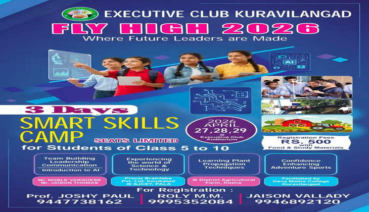 കുറവിലങ്ങാട്: എക്സിക്യൂട്ടീവ് ക്ലബ് കുട്ടികള്ക്കായി അവധിക്കാലത്ത് നടത്തുന്ന ഫ്ലൈ ഹൈ 2026 സ്മാര്ട്ട് സ്കില് ക്യാമ്പ്'' ഈ വര്ഷവും ഏപ്രില് 27,28,29 തീയതികളില് എക്സിക്യൂട്ടീവ് ക്ലബ് ഹൗസില് നടത്തപെടുന്നു.