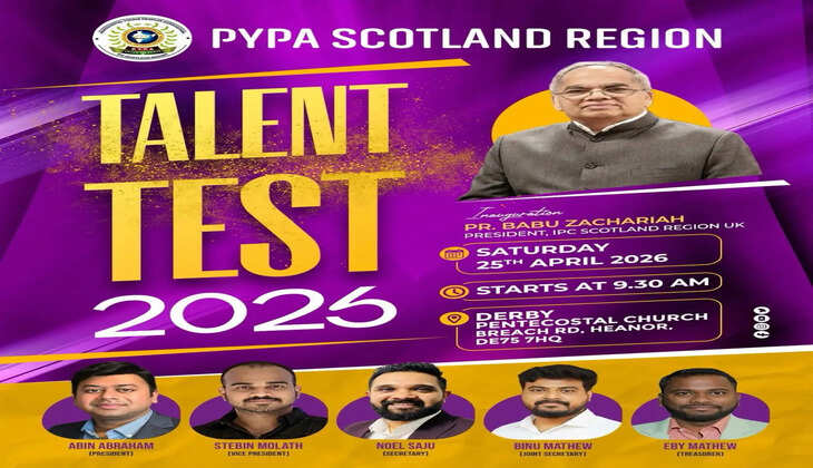 ഗ്ലാസ്ഗോ: ഐപിസി സ്കോട്ട്ലന്ഡ് റീജിയന്റെ പുത്രിക സംഘടനയായ പി വൈ പി എയുടെ 2026 ലെ താലന്ത് പരിശോധന ഏപ്രില് 25 തീയതി രാവിലെ 9:30 മണിക്ക് ഡെര്ബി പെന്തക്കോസ്ത് ചര്ച്ചില് വച്ച് നടത്തപ്പെടുന്നു. ഐപിസി സ്കോട്ടലന്ഡ് റീജിയന് പ്രസിഡന്റ് പാസ്റ്റര് ബാബു സക്കറിയ ഉദ്ഘാടനം ചെയ്യും. സ്കോട്ട്ലാന്ഡ് റീജിയന്റെ കീഴിലുള്ള സഭകള് പങ്കെടുക്കുന്നതായിരിക്കും.