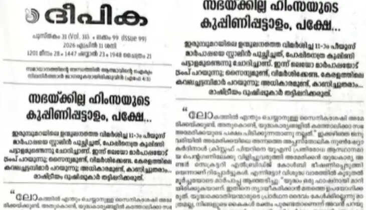 ബിജെപിക്കെതിരെ സ്റ്റാലിനെയും ട്രംപിനേയും ഉദ്ധരിച്ചാണ് ദീപികയുടെ മുഖപ്രസംഗം. ആഗോള തീവ്രവാദത്തിൻ്റെയും ഏകാധിപത്യത്തിൻ്റെയും ക്രൂരത യാഥാർഥ്യമാണ്. അതിനെതിരായ ചെറുത്തുനിൽപ്പ് എന്ത് അക്രമത്തിനുമുള്ള ബ്ലാങ്ക് ചെക്ക് അല്ല. ഭീഷണി യുദ്ധ കൊതിയനായ ട്രംപിൻ്റെ ആയാലും വർഗീയതയുടെ ഏജൻ്റുമാരായ കേരളത്തിലെ പ്രാദേശിക രാഷ്ട്രീയ കവല ചട്ടമ്പികളായാലും അത് മറക്കരുത് എന്നും ദീപിക ചൂണ്ടിക്കാട്ടി. സ്വന്തം ദുഷ്കൃത്യങ്ങളെ വിമർശിക്കുന്നവരെ ദേശദ്രോഹികളായി ചിത്രീകരിക്കുന്ന കുതന്ത്രത്തിൻ്റെ അമേരിക്കൻ പതിപ്പാണ് ഇതെന്നും മുഖപ്രസംഗത്തിൽ വ്യക്തമാക്കി.